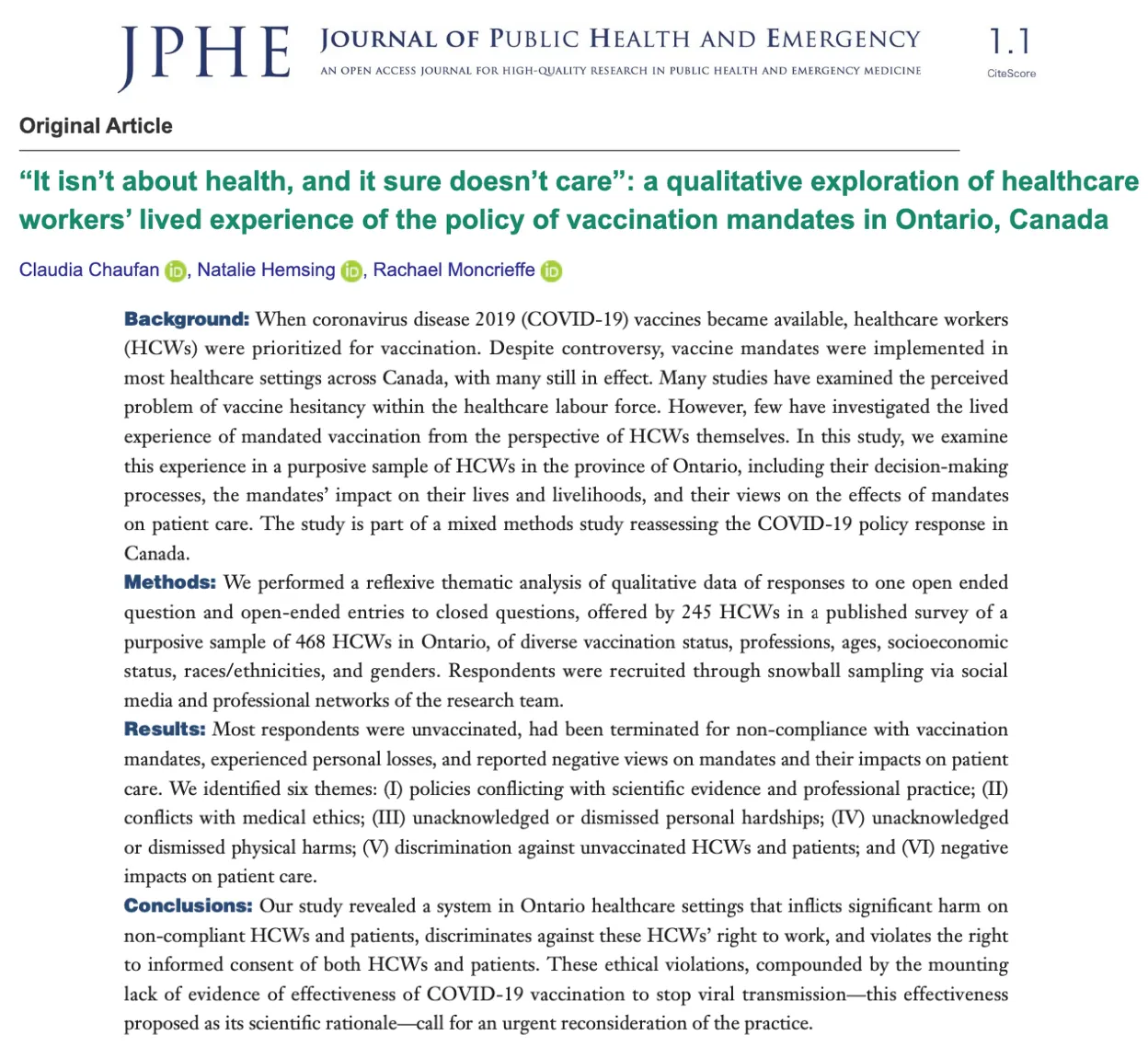 Eine neue Studie von Chaufan et al. mit dem Titel „Es geht nicht um Gesundheit – und sie kümmert sich schon gar nicht“: Eine qualitative Untersuchung der Erfahrungen von Gesundheitsfachkräften mit der Impfpflichtpolitik in Ontario, Kanada, wurde im Fachjournal Journal of Public Health and Emergency veröffentlicht.