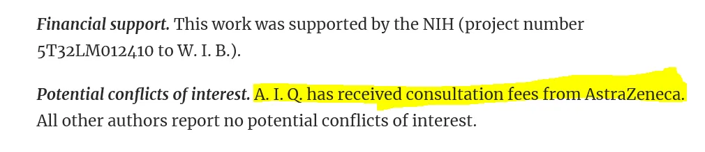 Noch merkwürdiger ist, dass der erstgenannte Autor, Adnan I. Qureshi, zufällig auch als Berater für AstraZeneca tätig ist, von dem man annehmen könnte, dass er sich für die Auswirkungen der Impfstoffe in diesem Zusammenhang interessiert: