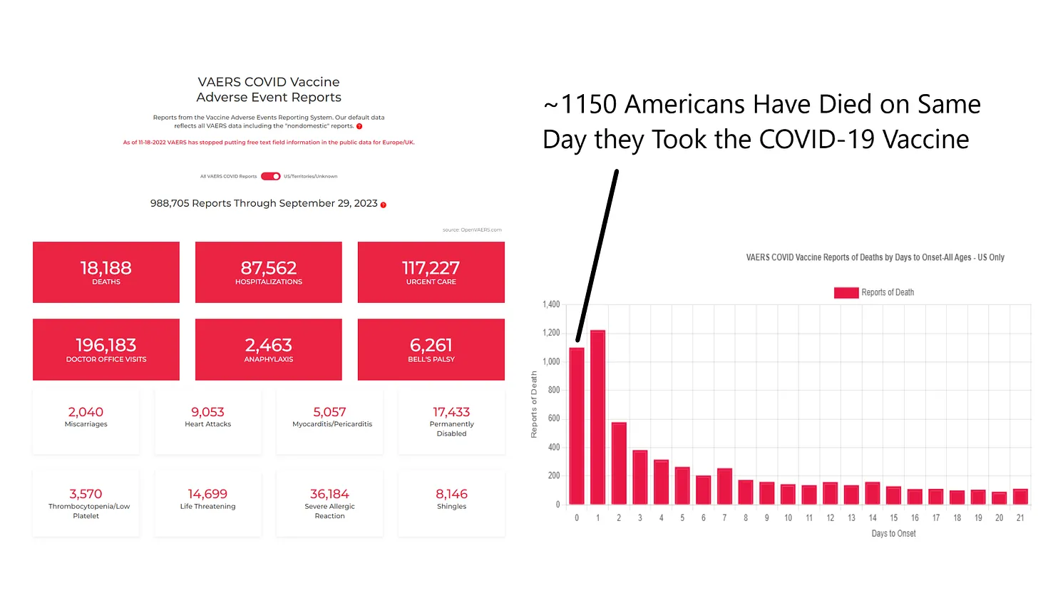 Das VAERS-System der US-amerikanischen Gesundheitsbehörde CDC hat durchgängig einen engen zeitlichen Zusammenhang zwischen dem Zeitpunkt der Verabreichung des COVID-19-Impfstoffs und dem Tag des der CDC gemeldeten Todesfalls gezeigt. Von den VAERS-Meldungen stammen 86 % von Ärzten, medizinischem Personal und den Impfstoffherstellern, die glauben, dass der Impfstoff mit dem Todesfall in Verbindung steht. Die zeitliche Häufigkeitskurve in VAERS ähnelt derjenigen von Suzumura und Hulscher et al.