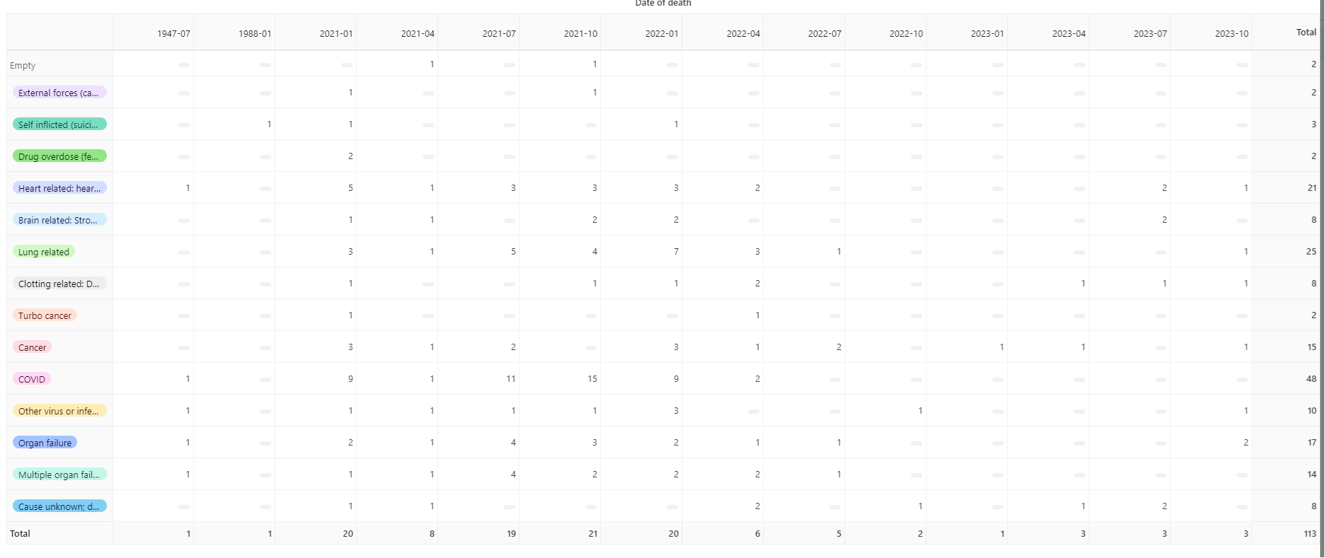 Die folgenden Bilder sind Pivot-Tabellen aus Airtable. Das Todesdatum ist die x-Achse, die Symptome sind die y-Achse. Sie können ein oder mehrere Symptome auswählen, die auf den Todesfall zutreffen. Bei den Daten außerhalb des Datumsbereichs handelte es sich um Fehler bei der Dateneingabe durch einige Teilnehmer.