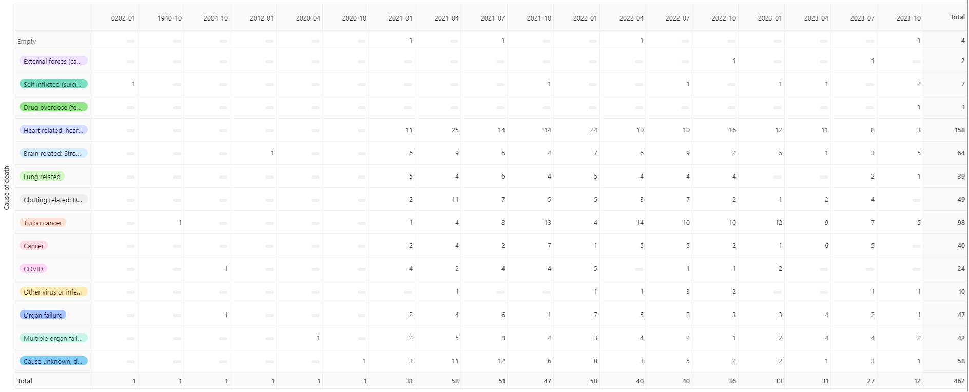 Die Realität ist, dass ich normalerweise über 10.000 Antworten auf Umfragen wie diese erhalte, aber bei dieser Umfrage habe ich nur über 500 Antworten bekommen, selbst nachdem ich die Leute angefleht habe. Das deutet darauf hin, dass etwa 90 % keine Todesfälle melden konnten. Diejenigen, die Todesfälle meldeten, hatten also nur EINEN Todesfall zur Auswahl. Sie wurden angewiesen, bei mehr als einem Todesfall denjenigen zu melden, dessen Einzelheiten sie am besten kannten. Das war’s.