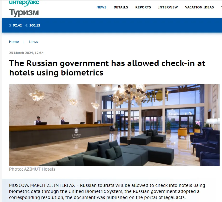 Die russische Regierung kündigte Ende März an, dass sich die Bürger in Hotels, Spas, Campingplätzen, Touristenzentren und medizinischen Kliniken mit biometrischen Daten registrieren lassen können, die im „freiwilligen“ Einheitlichen Biometrischen System gespeichert sind.
