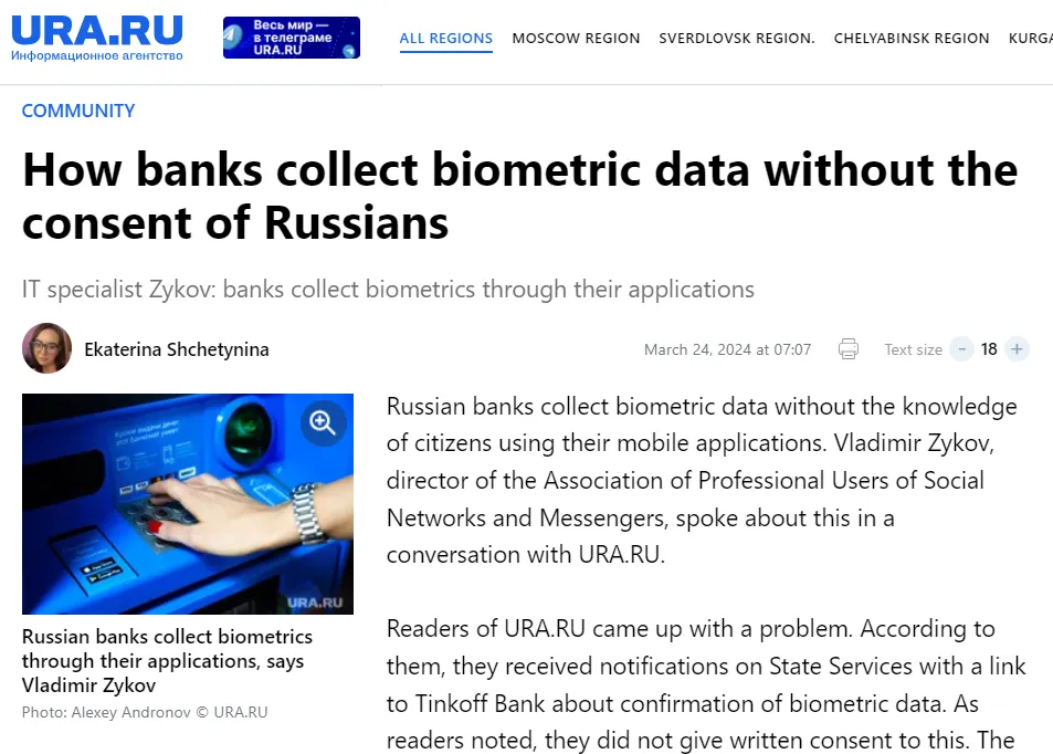 Russische Banken sammeln biometrische Daten ohne das Wissen der Bürger über ihre mobilen Anwendungen. Vladimir Zykov, Direktor des Verbandes der professionellen Nutzer sozialer Netzwerke und Messenger, erzählte URA.RU davon.