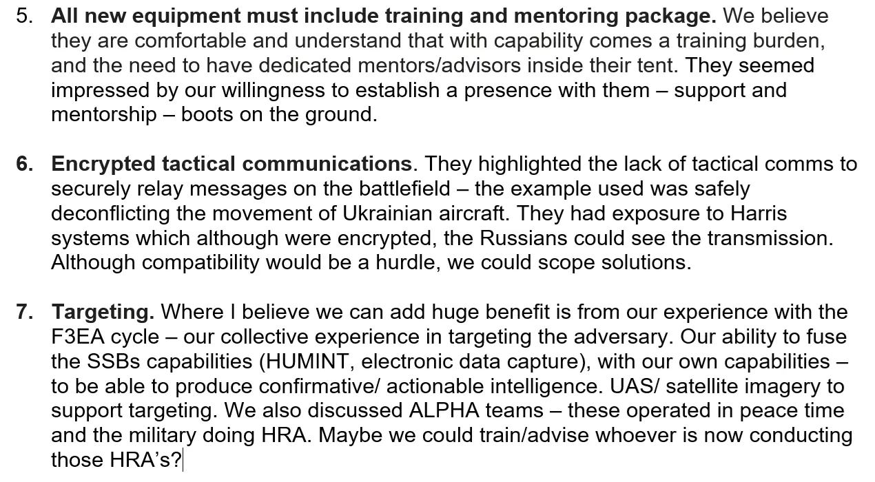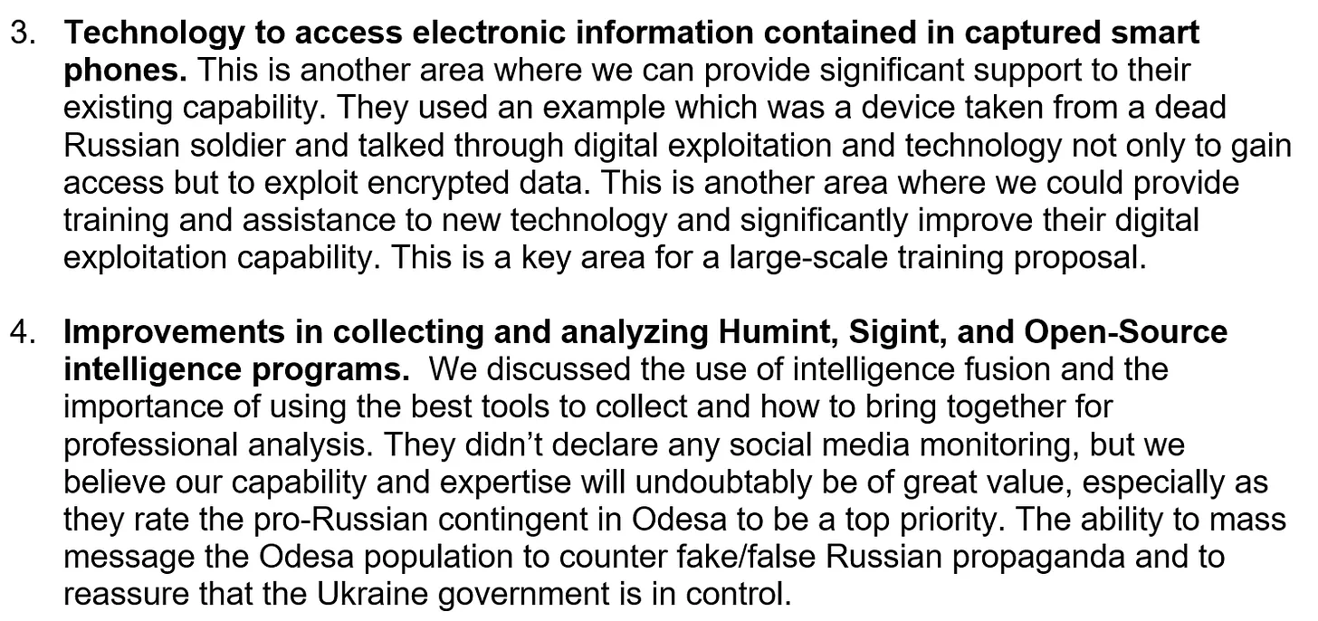 An anderer Stelle wurde in dem Vorschlag darauf hingewiesen, dass der SBU „Technologie für den Zugriff auf elektronische Informationen in beschlagnahmten Smartphones“ suchte, was „ein weiterer Bereich war, in dem wir die bestehenden Fähigkeiten“ der Behörde „erheblich unterstützen“ konnten, einschließlich des Zugriffs auf verschlüsselte Daten. Dies würde „Verbesserungen bei der Sammlung und Analyse“ von Informationen über Personen, Signalen und Open-Source-Informationen, einschließlich der „Überwachung sozialer Medien“, ermöglichen. Das Dokument kam zu dem Schluss, dass Prevail und TIW aufgrund der „gemeinsamen Erfahrung“ der Unternehmen mit dem „F3EA-Zyklus“ einen „enormen Nutzen“ für die Informationsbeschaffungs- und Handlungsfähigkeit der SBU haben könnten.