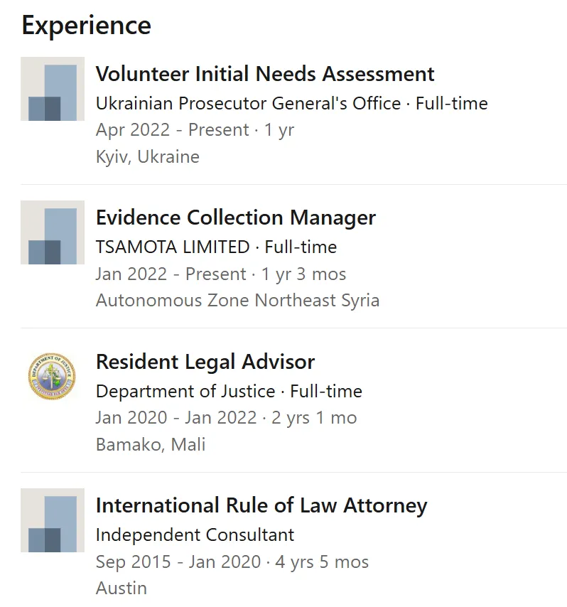 Auf seiner Landingpage wurden auch die Namen der TIW-Mitarbeiter genannt. Unter ihnen war Peter Becker, ein US-Militärangehöriger, der sich später in Afghanistan und im Irak auf internationales Recht spezialisiert hatte. Seinem LinkedIn-Profil zufolge ist er seit Anfang 2022 als „Evidence Collection Manager” für Tsamota im Nordosten Syriens tätig und arbeitet gleichzeitig in der ukrainischen Generalstaatsanwaltschaft. Darüber hinaus deuten durchgesickerte Dokumente darauf hin, dass Becker eine private Beratung mit dem stellvertretenden Direktor des SBU in Odessa darüber leitete, wie Prevail und TIW die Arbeit der Behörde unterstützen könnten.