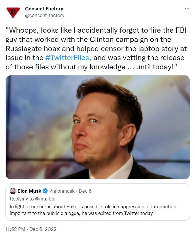 Hier ist die andere Sache, die mich stört (d.h., zusätzlich zu der Tatsache, dass sich diese Geschichte allmählich zu einem „rot-blauen“ Schlagabtausch entwickelt). Sie haben die Nachrichten darüber gesehen, wie James Baker, der FBI-Mann, der mit dem Clinton-Team zusammengearbeitet hat, um den Russiagate-Schwindel zu begehen, und eine Hand bei der Zensur der Hunter-Biden-Laptop-Geschichte hatte, die Twitter-Dateien „überprüfte“, bevor sie veröffentlicht wurden. Nun, der Geschichte zufolge hat Baker diese „Überprüfung“ ohne Wissen von Elon Musk durchgeführt, der anscheinend versehentlich vergessen hatte, seinen stellvertretenden Chefsyndikus zu feuern (von dem er seit mindestens acht Monaten wusste), als er all die anderen liberalen „schlechten Äpfel“ feuerte, und so hatte Elon, der sozusagen völlig „im Dunkeln“ tappte, absolut keine Ahnung, was Baker mit den Twitter-Dateien anstellte, bis Bari Weiss es bemerkte und ihn darauf aufmerksam machte.