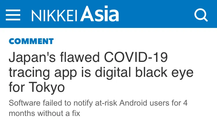 Abgesehen davon, dass die Vertragsverfolgung für Viren mit niedrigem IFR-Wert von vornherein schlecht durchdacht ist, funktionierte die App nicht richtig, und den meisten Benutzern fiel nichts Nettes dazu ein. Also wird sicher auch die japanische Regierung diesen Unsinn aufgeben, oder? Oh, wenn es nur so wäre.
