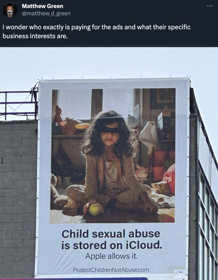Es handelt sich um eine Anzeige – ein Werbeplakat -, das anscheinend in den USA angezeigt wird, obwohl die Hauptfront des Kampfes um die Überwachung von Inhalten auf möglichen Missbrauch von Kindern (aber Kritiker sagen, es handelt sich wirklich um einen nicht so verhüllten Angriff auf die Ende-zu-Ende-Verschlüsselung als solche) in Europa geführt wird.