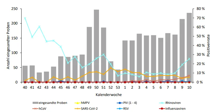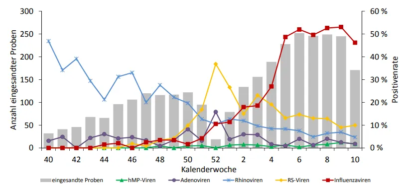 Rot ist die Grippe, gelb ist RSV, violettgrau (?) ist Adenovirus, blau ist Rhinovirus und grün ist Humanes Metapneumovirus. Die grauen Balken im Hintergrund sind die Anzahl der getesteten Abstriche; die Prävalenz der einzelnen Viren wird als Positivitätsrate ausgedrückt.