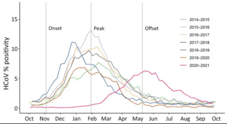 2) RSV und Adenovirus sowie einige der anderen häufigen Atemwegsviren erreichen ihren Höhepunkt um die Wintersonnenwende oder kurz danach. Leider hat das Robert Koch-Institut die hCoVs in der Saison 2018/19 nicht verfolgt, aber hier ist eine aktuelle amerikanische Arbeit, die belegt, dass sie in der Tat ungefähr den gleichen Höhepunkt im Januar oder Anfang Februar haben – mit der interessanten Ausnahme von 2020/21, als Eindämmungsmaßnahmen die Saison plausibel verzögert haben: