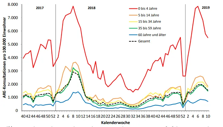 Nun zum zweiten Beweis, der noch aussagekräftiger ist als die Überwachungsdaten und der viele der Einwände, die dagegen vorgebracht werden könnten, entkräftet. Die Grippe unterscheidet sich von SARS-2 und gewöhnlichen humanen Coronaviren darin, dass sie auch für Säuglinge und Kinder unter vier Jahren gefährlich ist. Daher werden in jeder Grippesaison viele Kinder zum Arzt gebracht. Hier ist die Häufigkeit der Konsultationen für akute Atemwegsinfektionen nach Altersgruppe für die Grippesaison 2017/18 und 2018/19: