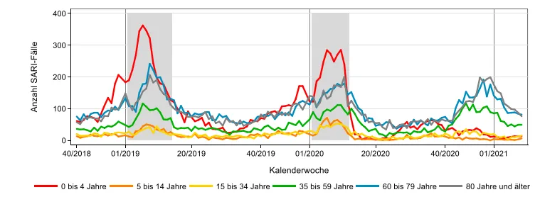 Die Daten zu Krankenhausaufenthalten zeigen das Gleiche. Hier ist eine Tabelle mit allen Personen, die seit der Saison 2018/19 mindestens eine Woche wegen einer schweren akuten Atemwegsinfektion im Krankenhaus waren: