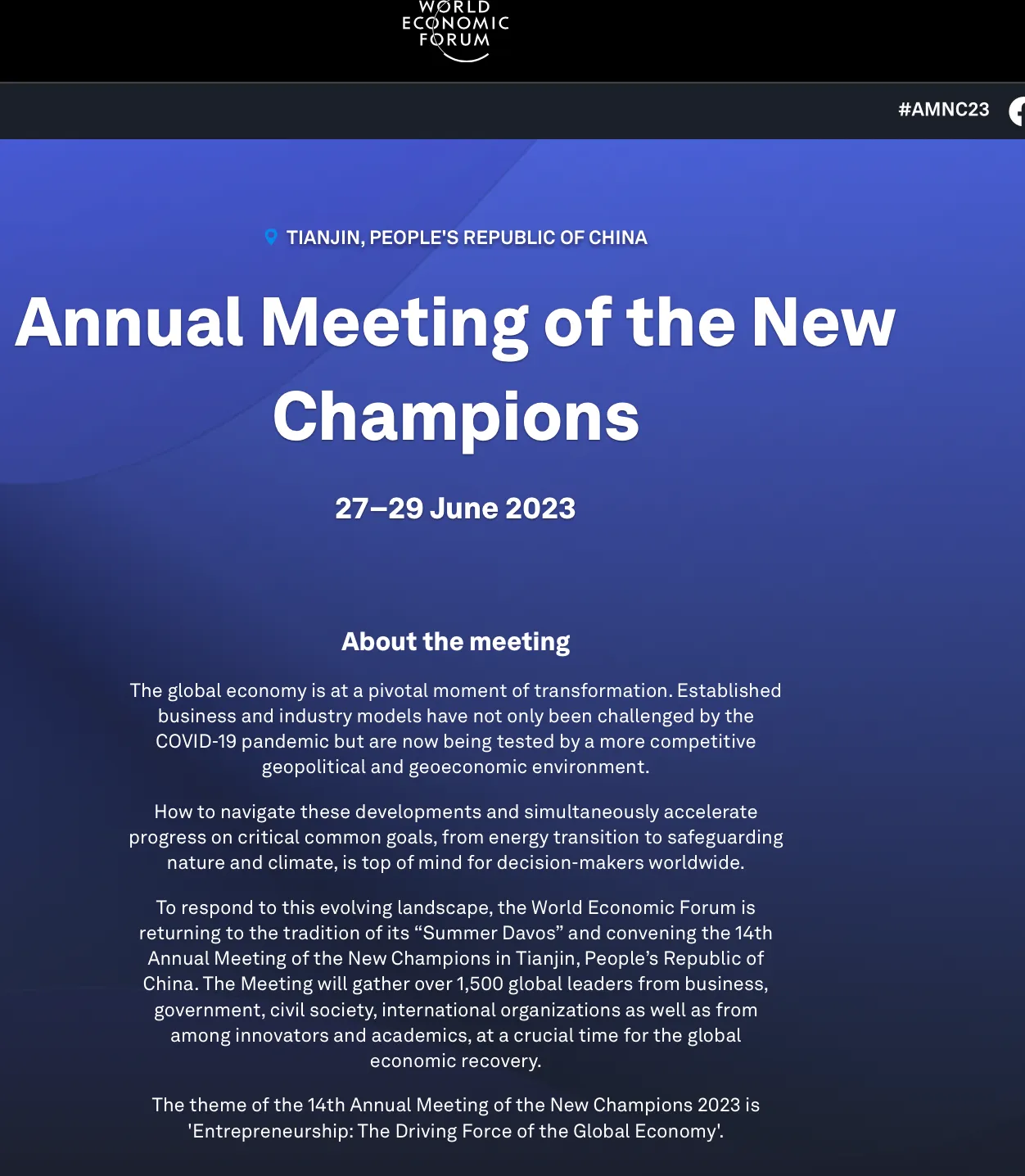 „Um auf dieses sich verändernde Umfeld zu reagieren, kehrt das Weltwirtschaftsforum zur Tradition seines ‚Sommer-Davos‘ zurück und veranstaltet das 14. jährliche Treffen der New Champions in Tianjin, Volksrepublik China. Das Treffen wird mehr als 1.500 globale Führungspersönlichkeiten aus Wirtschaft, Regierung, Zivilgesellschaft, internationalen Organisationen sowie aus dem Kreis der Innovatoren und Akademiker versammeln, und das zu einem Zeitpunkt, der für die globale wirtschaftliche Erholung von entscheidender Bedeutung ist.“