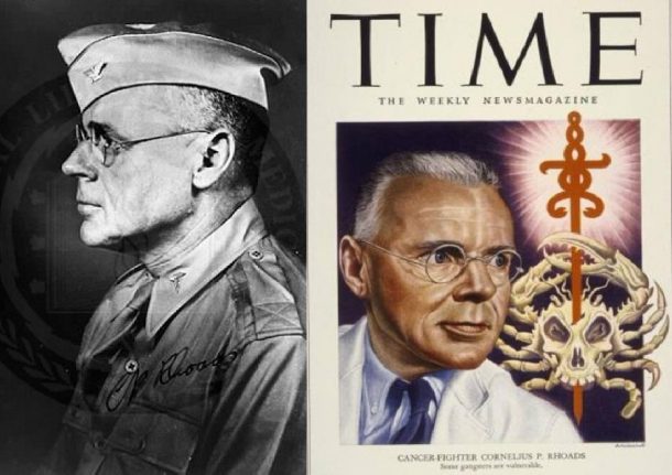 In den 1930er Jahren unterstützte die Rockefeller-Stiftung die Erforschung von Krebsbehandlungen durch Dr. Simon Flexner, der ein Treuhänder der Rockefeller-Stiftung, der erste Direktor des Rockefeller-Instituts für medizinische Forschung und Bruder von Abraham Flexner war, sowie durch einen Kollegen von Simon, der in seinem Labor am Rockefeller-Institut arbeitete, namens Cornelius P. Rhoads. Dr. Rhoads wurde 1932 von der Rockefeller-Stiftung beauftragt, in Puerto Rico durch Blut übertragbare Krankheiten zu erforschen. Während seines Aufenthalts auf der Insel schrieb Rhoads einen Brief an einen Kollegen, in dem er mit der Ermordung mehrerer Patienten prahlte und erklärte: „Sie [die Puertoricaner] sind zweifellos die schmutzigste, faulste, degenerierteste und diebischste Menschenrasse, die jemals in dieser Welt gelebt hat. Es macht einen krank, mit ihnen auf der gleichen Insel zu leben. Sie sind sogar noch niedriger als die Italiener. Was die Insel braucht, ist keine öffentliche Gesundheitsfürsorge, sondern eine Flutwelle oder etwas anderes, um die Bevölkerung völlig auszurotten. Dann wäre sie vielleicht bewohnbar. Ich habe mein Bestes getan, um den Prozess der Ausrottung voranzutreiben, indem ich 8 von ihnen getötet und einigen weiteren Krebs eingepflanzt habe. Letzteres hat bisher zu keinem einzigen Todesfall geführt … Die Rücksicht auf das Wohl der Patienten spielt hier keine Rolle – im Gegenteil, alle Ärzte haben Freude an der Misshandlung und Folterung der unglücklichen Probanden.“ Der Brief wurde von einem Kollegen entdeckt und öffentlich gemacht, woraufhin Rhoads von der Insel floh. Trotz des öffentlichen Aufschreis leitete Rhoads weiterhin die Abteilung für biologische Waffen der US-Armee, von der aus er angeblich Strahlungsexperimente an Tausenden von amerikanischen Bürgern durchführte. Die Erforschung von Senfgas führte tatsächlich zum Einsatz des giftigen Mittels in der Chemotherapie am „Sloan Kettering Institute“, dessen Direktor Rhoads war. Trotz seiner unethischen Menschenversuche wurde Rhoads auf der Titelseite des „Time Magazine“ verewigt und mit dem Cornelius P. Rhoads Memorial Award ausgezeichnet – sehr zum Entsetzen der Puertoricaner, die den Arzt als völkermordenden, verrückten Wissenschaftler bezeichneten, der von der „Rockefeller Foundation“ voll unterstützt wurde.