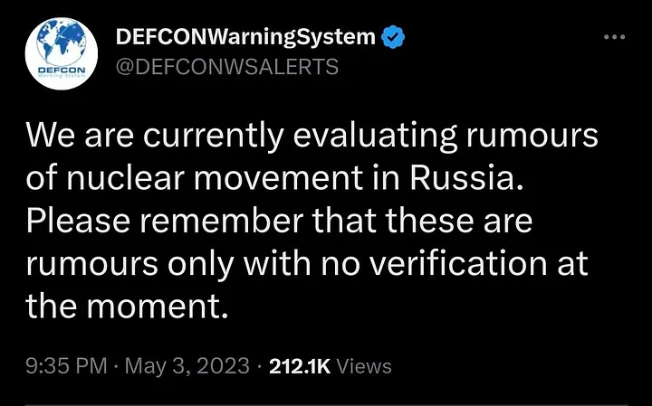 Und was sind das für Gerüchte über Atomwaffen? Nun, nach dem Angriff des Kremls begann der Twitter-Account des Defcon-Warnsystems, Ängste zu schüren, indem er Gerüchten Glauben schenkte, dass Russlands strategische Atomwaffen in erhöhte Alarmbereitschaft versetzt wurden: