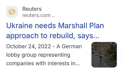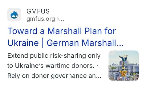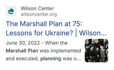 „In diesem Sinne schlagen wir eine moderne Version des Marshall-Plans für die Ukraine vor, die den Geist des Originals aufgreift, aber auf den Grundsätzen und Anreizen der freien Marktwirtschaft beruht – eine Version, die sowohl den heutigen Privat- und Risikokapitalsektor als auch die Regierungen einbeziehen kann, die bereit sind, einer neuen Ukraine zu helfen, aus den Ruinen der alten aufzusteigen.„