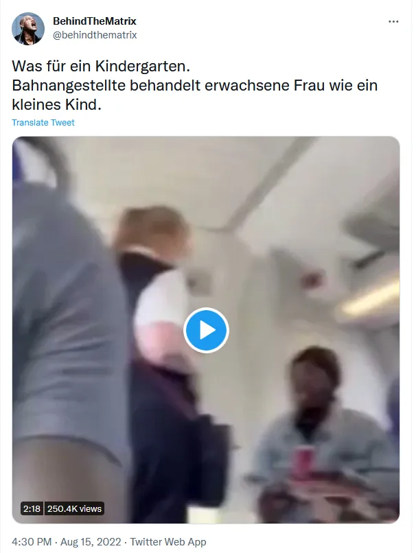 Und das ist nur eines der zahlreichen Beispiele für den faschistischen Geist, der das Land ergriffen hat, in das ich vor fast genau 18 Jahren freiwillig ausgewandert bin und das ich heute nicht mehr wiedererkenne. Hier ist ein weiteres Beispiel, das Ihnen den Magen umdrehen wird. Es handelt sich um einen Videoclip, in dem ein Gestapo-Beamter der Deutschen Bahn (eine neu geschaffene offizielle Position, die früher als „Zugführer“ bekannt war) wie in einem Spielberg-Film einer maskenlosen Frau immer und immer wieder Befehle entgegenbrüllt und sie schließlich körperlich angreift …