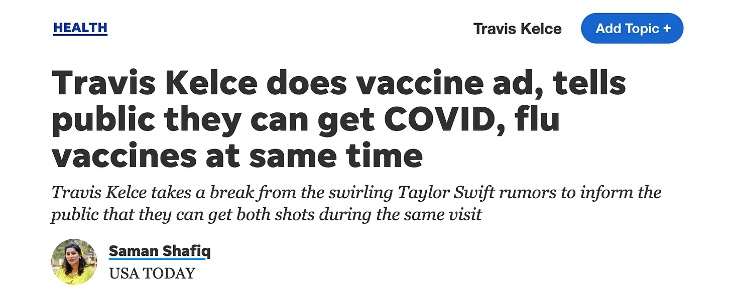Ganz zu schweigen von den Impfstoffkampagnen von Pfizer, die Prominente dafür bezahlen, von der wunderbar „sicheren und wirksamen“ mRNA-Impfung zu schwärmen. Travis Kelce – ein professioneller Footballspieler, der von vielen jungen amerikanischen Männern beobachtet und verehrt wird – warb bei einem Besuch für die aktuelle Auffrischungsimpfung und den Grippeimpfstoff.