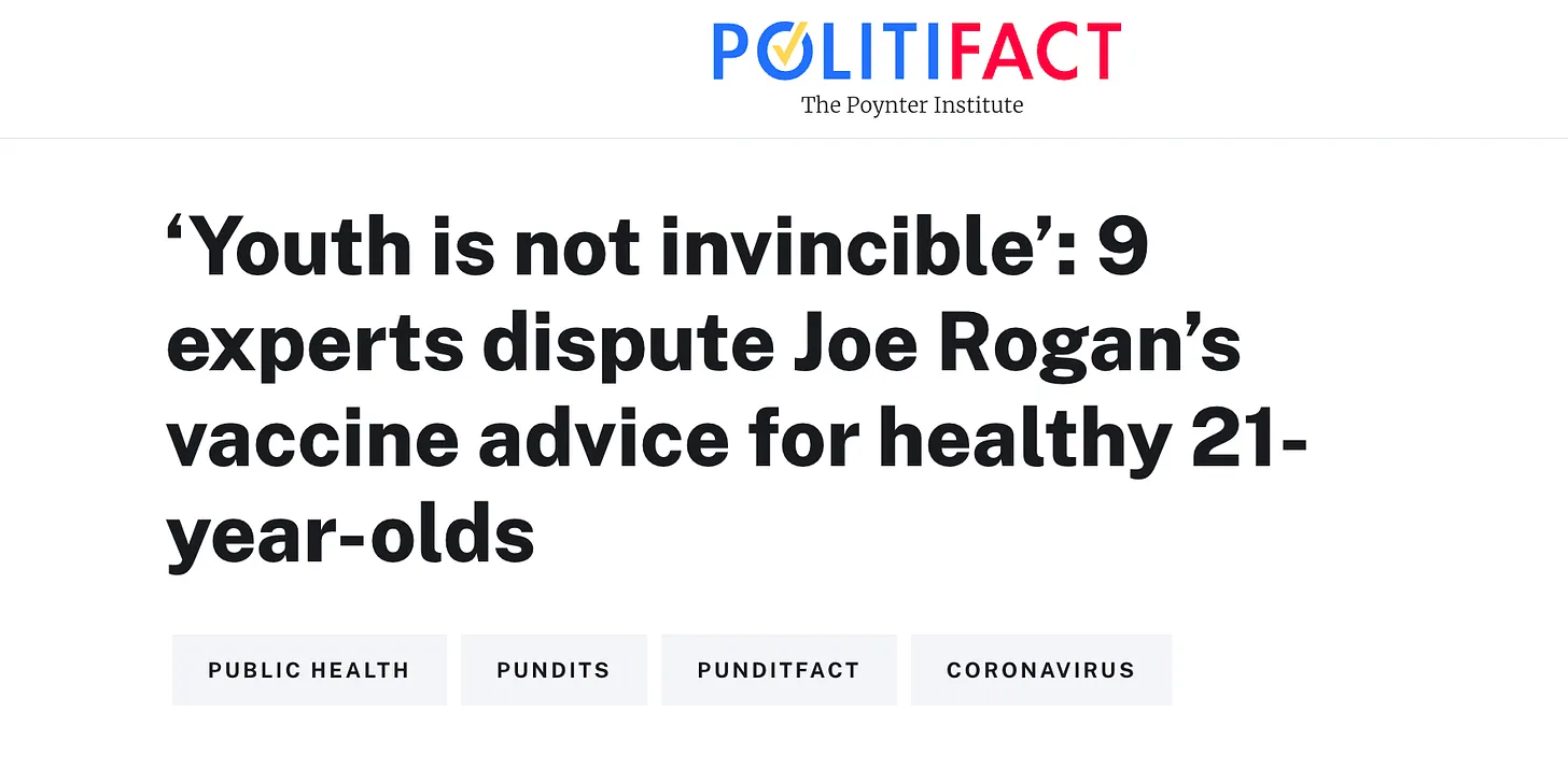 Als zugegebenermaßen voreingenommener Zoomer wuchs eine der diskreditierendsten medialen Angriffskampagnen gegen Joe Rogans Behauptung in einem Podcast vom Juni 2021, dass gesunde 21-Jährige den Impfstoff nicht bräuchten. Mehr als zwei Jahre später hat sich Rogans Urteil – wie schon damals – angesichts des Sterberisikos von 0,003 % bei den 20-Jährigen und der ungewöhnlich hohen Raten myokardialer und menstruationsbedingter Impfnebenwirkungen als richtig erwiesen. Das Ökosystem der Mainstream-Medien hat jedoch als Reaktion auf Rogans unzulässige Abweichung von den CDC- und Pfizer-Vorgaben eine heftige Rufschädigung durchgeführt: