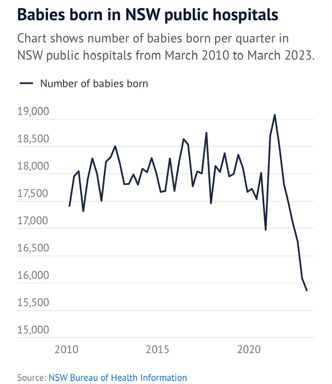 Dennoch haben die Medien kaum über die sinkenden Geburtenzahlen berichtet. Wenn sie es doch tun, dann suchen sie nach Erklärungen, die nicht von der RNA stammen. Als eine australische Zeitung über den Geburtenrückgang in New South Wales berichtete, brachte sie diesen Heuler: