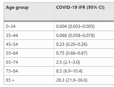 Diese Spitzen bei der Sterblichkeit unter jungen Menschen sind auffällig, weil schon seit langem bekannt ist, dass die Infektionssterblichkeitsrate (IFR) von COVID bei älteren Menschen extrem verzerrt ist. Dies sind zum Beispiel die am häufigsten zitierten Daten zur IFR von COVID nach Alter: