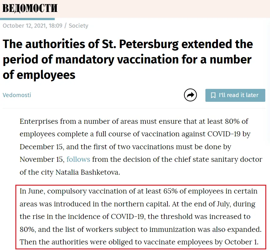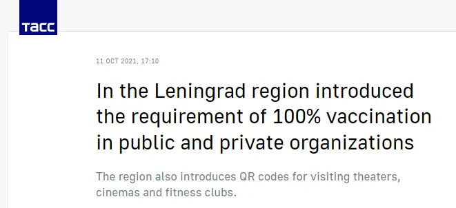 St. Petersburg wies die Arbeitgeber zunächst an, 65 % ihrer Arbeitnehmer zu impfen. Im Oktober 2021 wurde der Erlass auf 80 % geändert.
