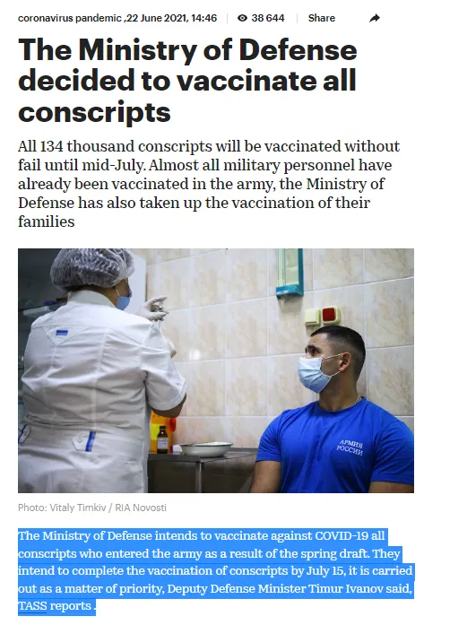 Die medizinische Versorgung von Militärangehörigen ist eine Priorität für den Staat. Gemäß der Verordnung Nr. 129 des Chefarztes des russischen Verteidigungsministeriums vom 18. Juni 2021 gilt die Impfpflicht für alle Kategorien von Militärangehörigen, einschließlich derjenigen, die zur Mobilisierung einberufen werden.