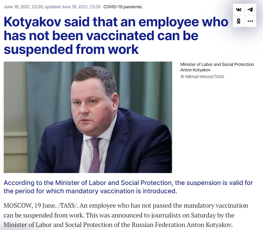 Arbeitsminister Anton Kotyakov sagte am 19. Juni 2021, dass Personen in diesen Sektoren, die sich weigern, sich impfen zu lassen, auf unbestimmte Zeit von der Arbeit suspendiert werden können.