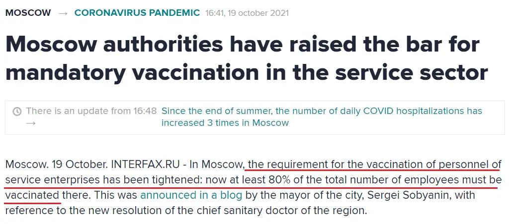 Die ursprüngliche Moskauer Pflichtimpfungsverordnung vom Juni 2021 sah vor, dass die Arbeitgeber 60% ihrer Arbeitnehmer impfen lassen mussten. Doch im Oktober desselben Jahres wurde diese Vorschrift auf 80 % erhöht.