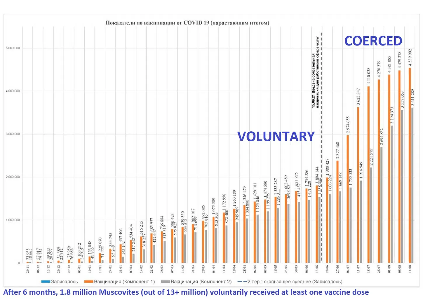 Wurde diese Politik „in die Praxis umgesetzt“? Natürlich wurde sie umgesetzt. Innerhalb von zwei Monaten hat sich die Zahl der geimpften Einwohner in Moskau mehr als verdoppelt.