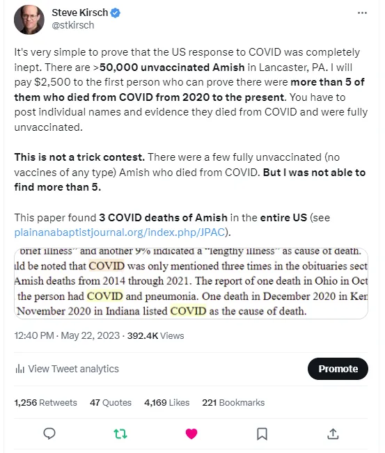 Am 22. Mai 2023 setzte ich eine Belohnung von 2.500 Dollar für denjenigen aus, der mir die Namen von mehr als fünf Amish-Personen in Lancaster, PA (mit über 45.000 Einwohnern die größte Amish-Gemeinde der Welt) nennt, die an COVID gestorben sind.