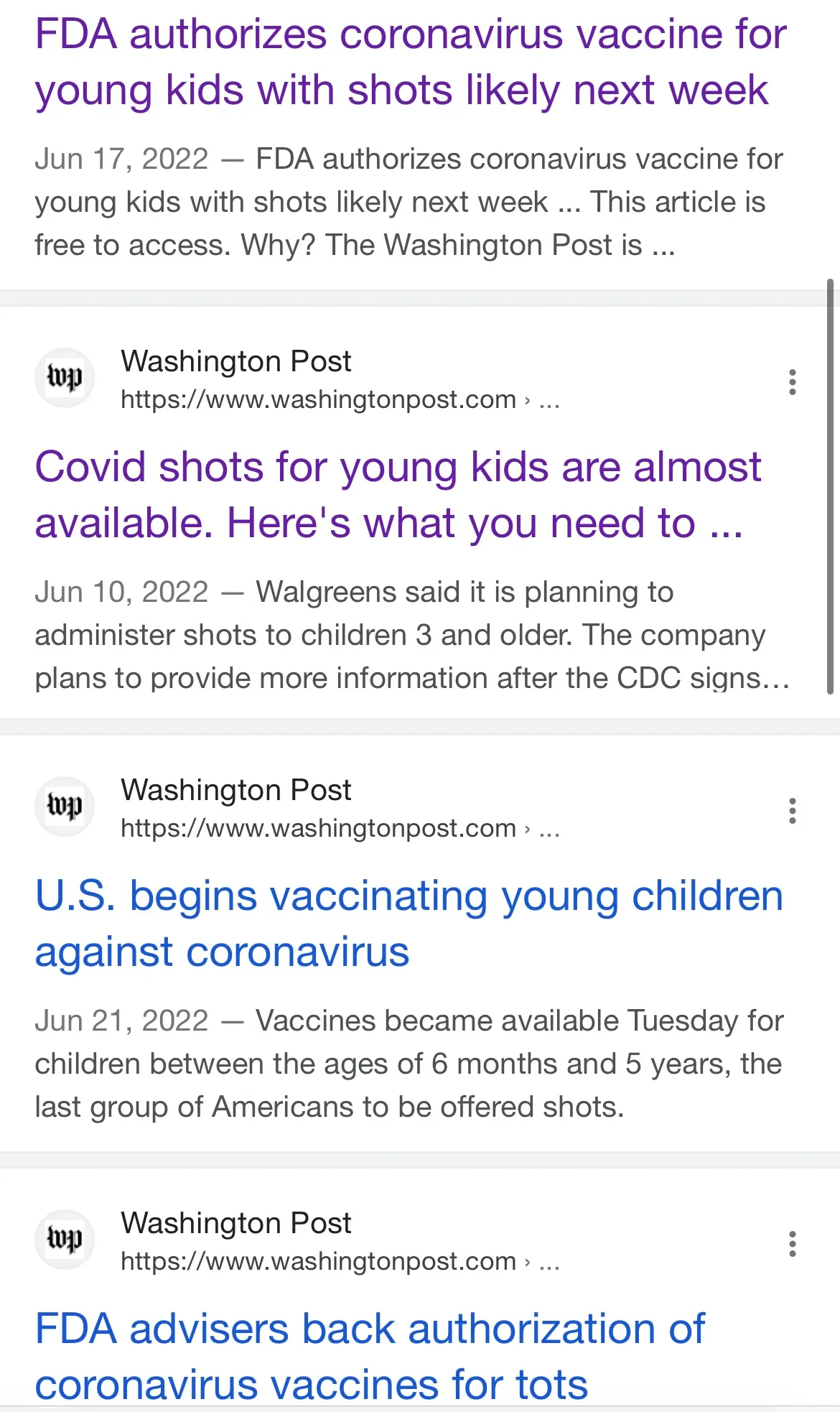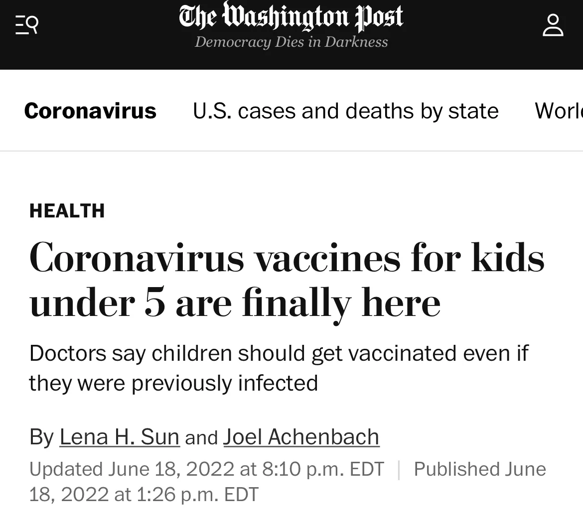 Tatsächlich war die Medienkampagne rund um die Kinderimpfungen so unerbittlich wie jeder andere Aspekt der Impfstoffbefürwortung seit Beginn der mRNA-Impfungen im Dezember 2020. Wie schon bei früheren Kampagnen umfasste sie bezahlte Werbung, kostenlose Werbespots und offene, als Journalismus getarnte Befürwortung („Ärzte sagen, dass Kinder geimpft werden sollten, auch wenn sie zuvor infiziert waren“).