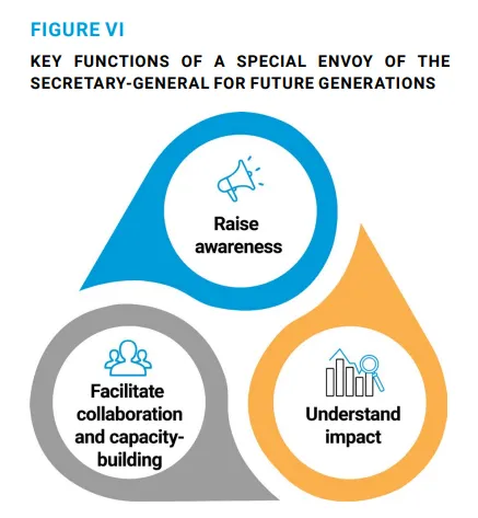 Der Abgesandte sollte eine große Medienpersönlichkeit sein, die von jungen Menschen erkannt und respektiert wird, um den Grundsatz der Generationengerechtigkeit zu stärken. Es ist riskant, nur eine Person zu benennen; stattdessen sollte ein Team gebildet werden, zu dem auch der Generalsekretär der Vereinten Nationen gehört, wenn er in den Ruhestand geht, und/oder eine Person aus jedem Kontinent, die als Team zusammenarbeitet, sogar mit einer vertrauenswürdigen künstlichen Intelligenz.10