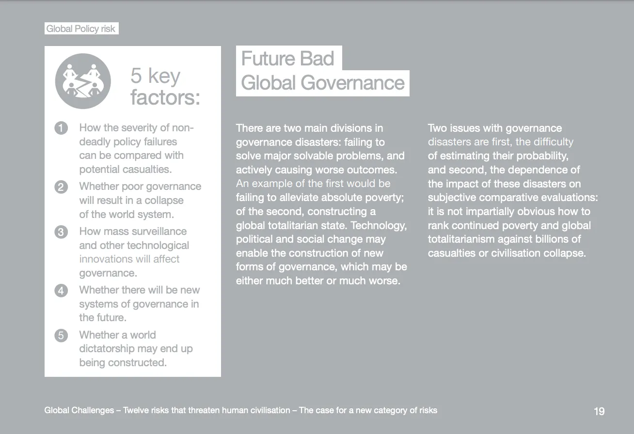 Der Bericht erörterte auch das Thema „schlechte Global Governance“ und warnte davor, dass ein globaler totalitärer Staat auf dem Vormarsch sein könnte, um die großen globalen Probleme zu lösen, deutete aber gleichzeitig an, dass ein Zusammenbruch der Zivilisation oder der Verlust von Milliarden von Menschenleben schlimmer sein könnte. Diese beiden konkurrierenden Ergebnisse waren nicht einfach zu bewerten.