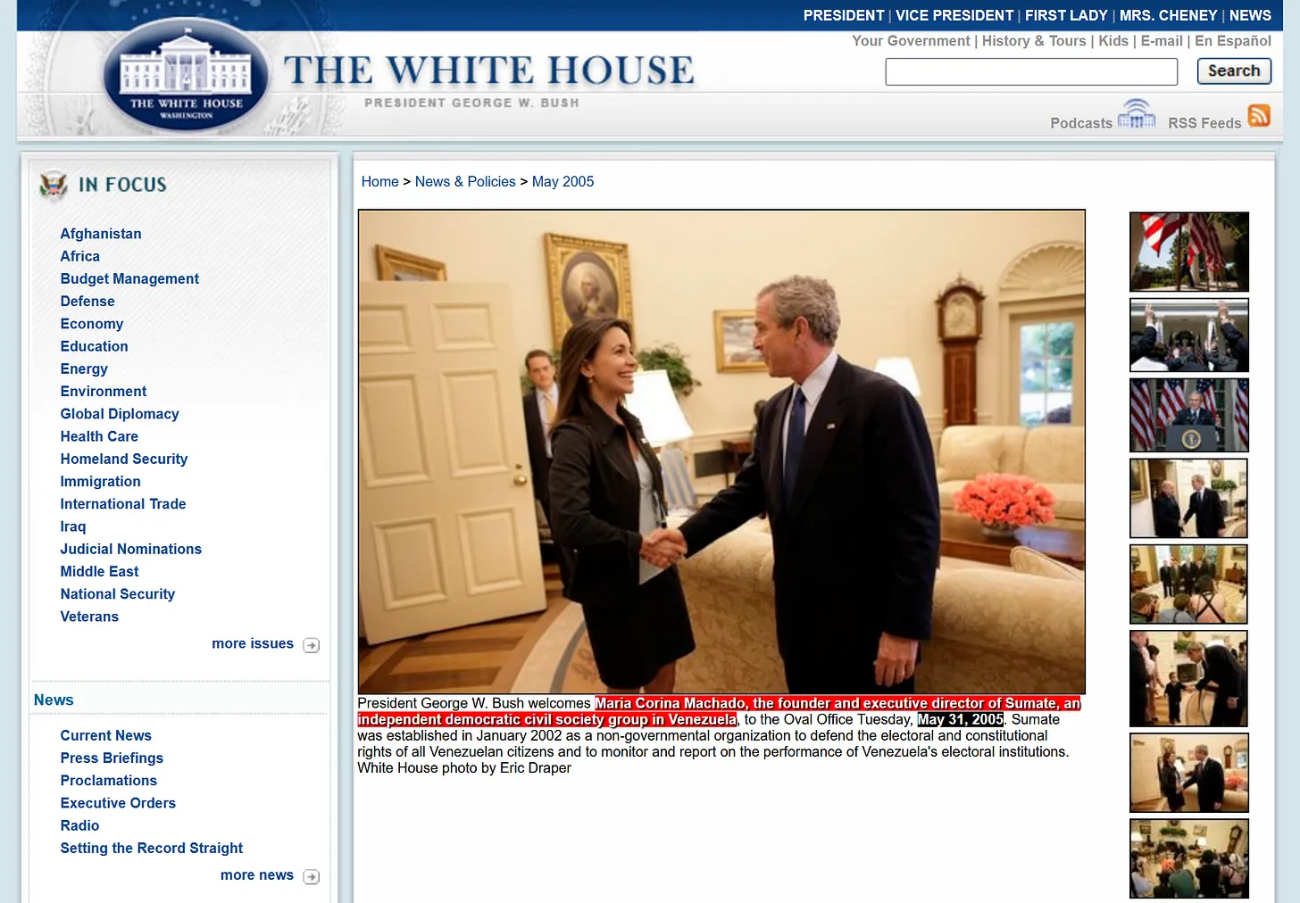 Machado wurde 2005 zu einem Treffen mit George W. Bush ins Weiße Haus eingeladen. (Dies war nur zwei Jahre, nachdem er in einem illegalen Angriffskrieg in den Irak einmarschiert war.