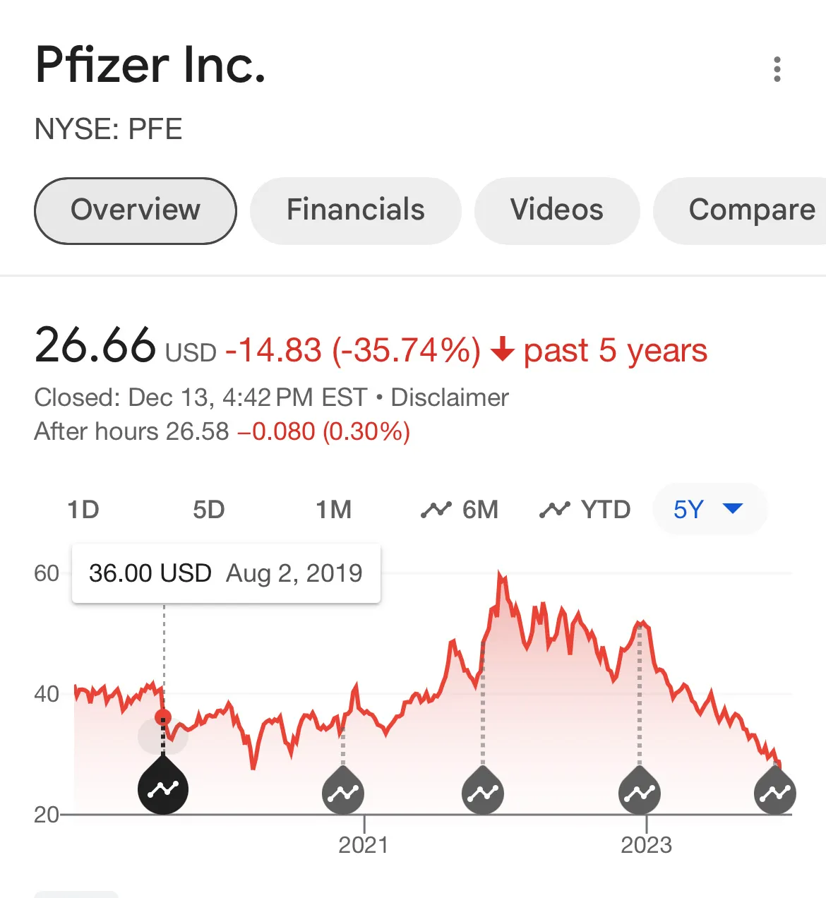 Das haben auch die Investoren bemerkt. Die Pfizer-Aktie schloss heute bei 26,72 Dollar – ein Minus von fast 7 Prozent heute und 50 Prozent in diesem Jahr und ein Fünfjahrestief.