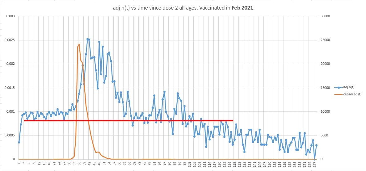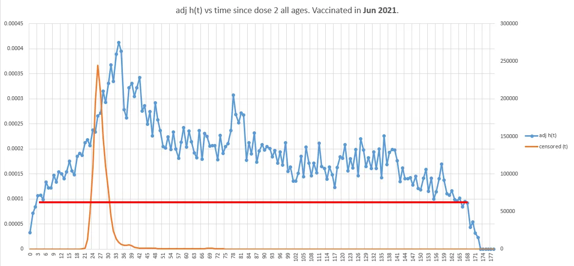 Wenn Sie nicht zensiert werden und einen Anstieg der Sterblichkeit in der Gruppe mit zwei Dosen feststellen, könnte das daran liegen, dass die meisten von ihnen eine dritte Dosis erhalten haben. Und deshalb habe ich eine Zensierung vermieden, damit Sie h(t) für GENAU DIE GLEICHE KOHORTE über die Zeit hinweg longitudinal verfolgen können, was mit einer Zensierung absolut niemals möglich ist (da eine Zensierung eine brandneue Kohorte mit unbekannter Basissterblichkeit schafft und Sie außerdem in Ihrer Gruppe mit Dosis 2 mit einer unbekannten Sterblichkeit danach zurücklässt). Kurz gesagt, Zensur ist großartig für Arbeiten, die nichts mit Impfstoffen zu tun haben, aber für Impfstoffstudien ist Zensur äußerst problematisch, da sie sich auf die Mortalitätszusammensetzung in diesen Studien auswirkt. Wenn Sie 1.000 50-Jährige haben und 90 % von ihnen sich für die nächste Impfung entscheiden, glauben Sie dann wirklich, dass die Sterblichkeitsrate der verbleibenden Kohorte davon unberührt bleibt? Natürlich nicht. Denn die Entscheidung für die Impfung war NICHT zufällig.