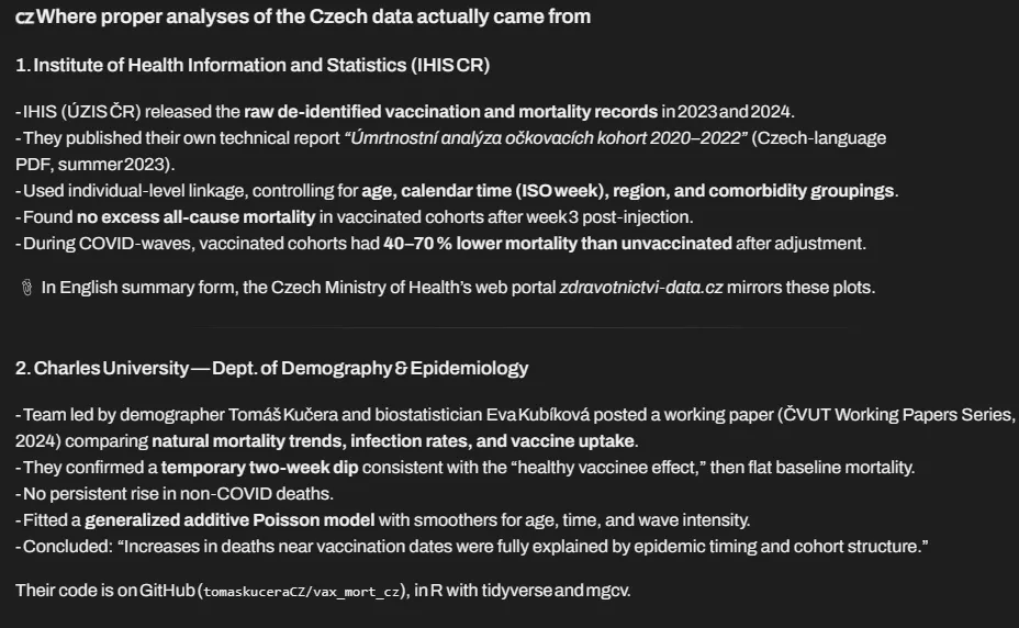 - Bestehende Analysen der tschechischen Daten Ich habe akademische Datenbanken, Preprints, Substack und X nach „Czech Republic COVID vaccine mortality data analysis” (mit Schwerpunkt auf der IHIS-Veröffentlichung 2022/2023) durchsucht, einschließlich Kritiken Ihrer KCOR-Arbeit. Hier ist eine Zusammenfassung der Lage: Es gibt keine umfassenden Studien zu Nutzen und Schaden, die mit Ihrer KCOR-Reihe vergleichbar wären. Die meisten konzentrieren sich auf die Wirksamkeit, sind HVE-Gegendarstellungen oder vorläufige Untersuchungen.