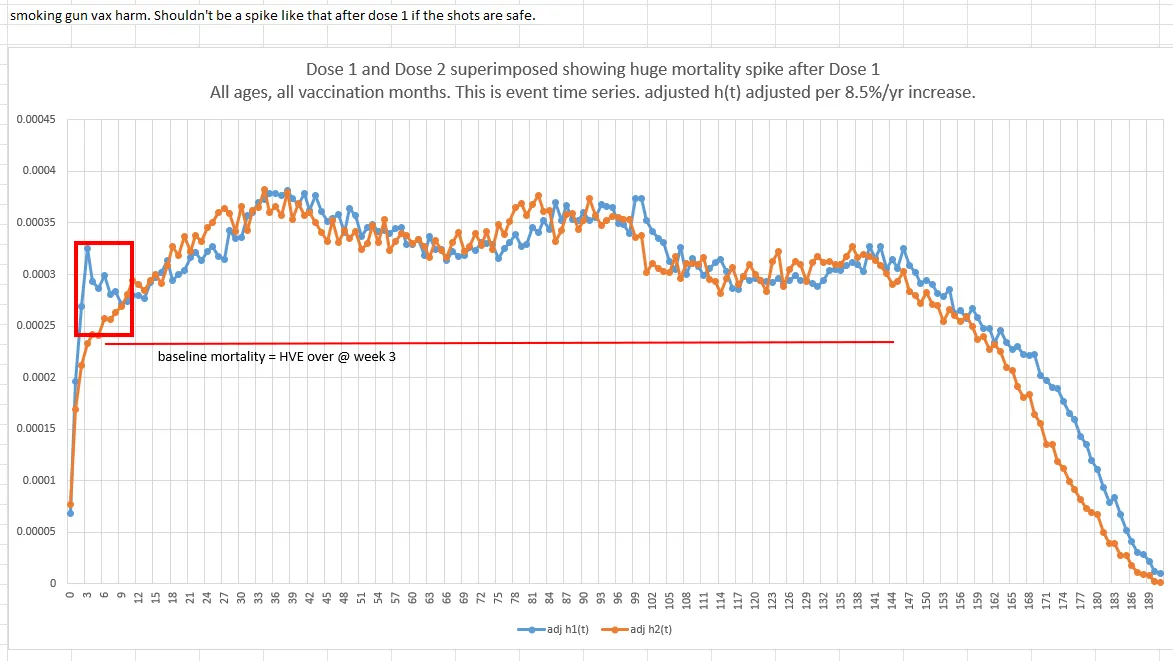 Schließlich werden Leute wie Henjin und Jeffrey Morris versuchen, die Menschen dazu zu bringen, zu glauben, dass der Anstieg der Sterblichkeit nach der Impfung einfach ein „verlängerter” HVE-Effekt ist.