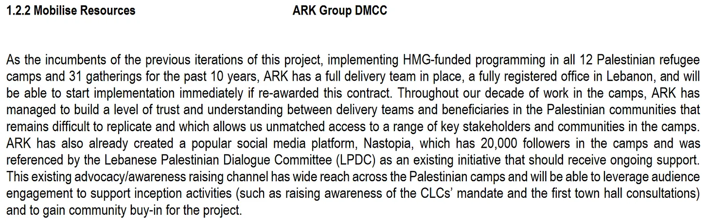 Seit 2009 ist der Auftragnehmer des Auswärtigen Amtes ARK, der vom MI6-Agenten Alistair Harris gegründet wurde und geleitet wird, in allen zwölf palästinensischen Flüchtlingslagern im Libanon tätig. In durchgesickerten Akten rühmt sich das Unternehmen seines „detaillierten Verständnisses“ der internen politischen, wirtschaftlichen, ideologischen, religiösen und alltäglichen Dynamiken der Lager. Die umfangreichen „lokalen Kontakte“ von ARK haben „Zugang zu allen Lagern und Versammlungen“. Das bedeutet, dass Diskussionen und Aktivitäten aller Bewohner auf Gemeindeebene je nach Bedarf beeinflusst und ausspioniert werden können.