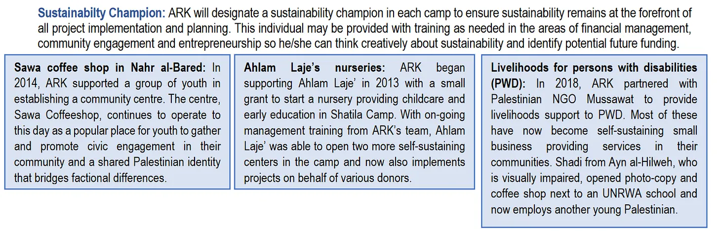 Natürlich wird dieses Ziel in den durchgesickerten Dokumenten nicht so formuliert. In einer Akte wird darauf hingewiesen, dass die Hervorhebung von „Erfolgsgeschichten“ in den Lagern „das Vertrauen des Publikums in die eigene Fähigkeit, zum sozialen Wandel beizutragen, stärkt“. Mit anderen Worten: Palästinensische Flüchtlinge werden ermutigt, die Dinge selbst in die Hand zu nehmen. Diese Absicht wird in einer durchgesickerten Zielgruppenanalyse von ARK vom März 2019 viel nachdrücklicher zum Ausdruck gebracht.