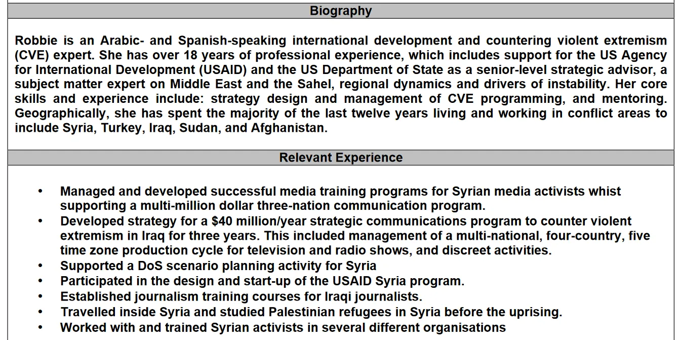 „Dieses Netzwerk ist in der Lage, bei der Entwicklung von Botschaften zu helfen und durch Mundpropaganda in schwer erreichbaren Gebieten Einfluss zu nehmen. Das durch diese Interaktionen gewonnene Wissen wird das kontextbezogene Verständnis schaffen, das die Grundlage für unsere Kommunikationskampagnen bildet, unsere Fähigkeit, ihre Wirkung zu bewerten und detaillierte Stimmungsberichte zu erstellen, die HMG über die sich entwickelnde Situation in Syrien informieren.“