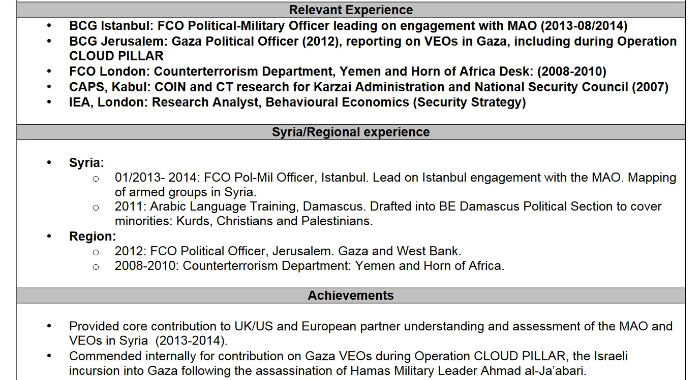 Winberg sammelte in dieser Rolle so viele wichtige Informationen, dass ihre daraus resultierenden Erkenntnisse einen „zentralen Beitrag“ zum Verständnis und zur Einschätzung bewaffneter Gruppen in Syrien durch Großbritannien, Europa und die USA darstellten. Interessanterweise wurde sie direkt vom britischen Konsulat in Jerusalem, einer wichtigen regionalen Operationsbasis für den MI6, nach Istanbul versetzt. Dort berichtete sie über „gewalttätige extremistische Organisationen“, die im Gazastreifen aktiv sind, „auch während der Operation Cloud Pillar“ im November 2012, wofür sie „intern gelobt“ wurde.