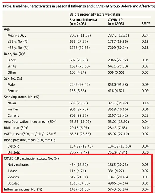 Die BASELINE-Merkmale waren in meinem Fall das verblüffende Ergebnis, weil die mit COVID ins Krankenhaus eingelieferten Personen nicht dasselbe Impfprofil aufweisen sollten wie die mit Grippe ins Krankenhaus eingelieferten Personen. Mehr dazu weiter unten.
