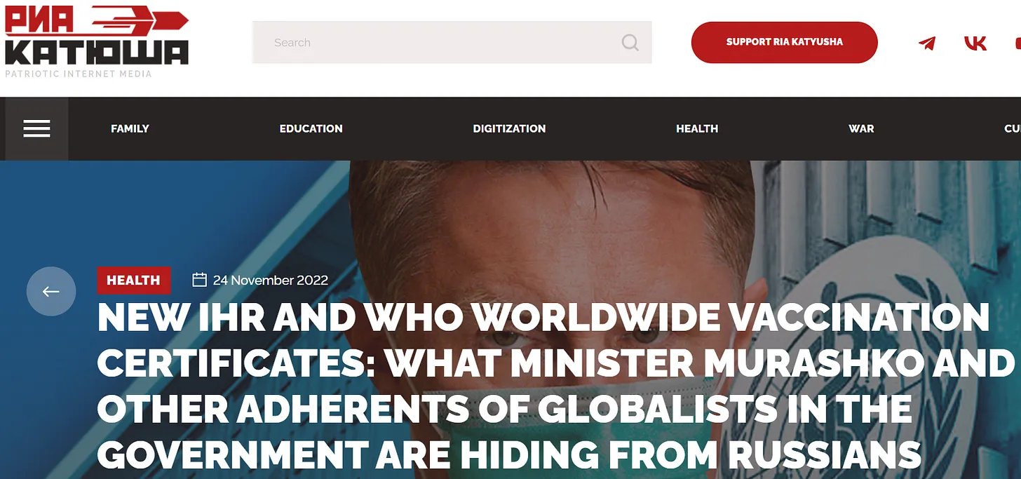 Ebenso ungeheuerlich ist die Behauptung, die russische Regierung unterstütze irgendeine Form von Viehmarken oder ein globales Biosicherheitstheater. Lesen Sie hier, was die ultra-patriotische russische Zeitung Katjuscha etwa zur gleichen Zeit veröffentlichte, als Schwab mit chinesischen Staatsmedien plauderte:
