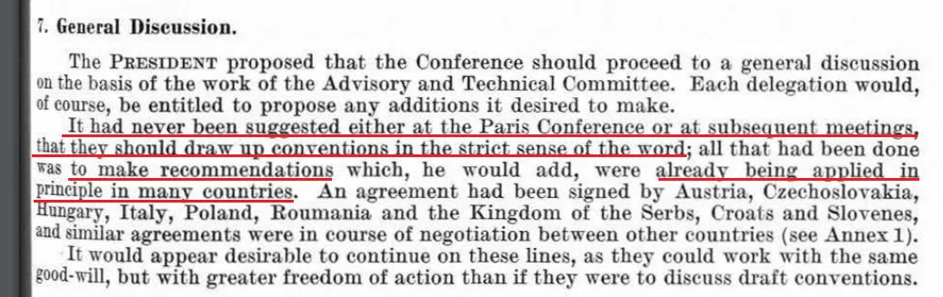 Weder auf der Pariser Konferenz noch auf den nachfolgenden Tagungen war jemals vorgeschlagen worden, dass [die Delegationen] Konventionen im engeren Sinne des Wortes ausarbeiten sollten; es waren lediglich Empfehlungen ausgesprochen worden, die … in vielen Ländern im Prinzip bereits angewandt wurden.