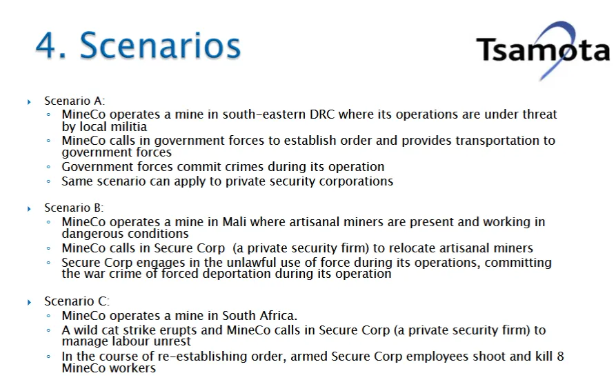 Im Jahr 2013 hielt William Wiley, Direktor von Tsamota, eine skandalöse Präsentation vor dem kanadischen Konsortium MineAfrica Inc. Darin stellte er eine Reihe hypothetischer Szenarien vor, in denen Bergbauunternehmen, die in Ländern wie dem Kongo und Mali tätig sind, private Sicherheitsfirmen einsetzen, um gegen streikende Arbeiter vorzugehen oder mit „lokalen Milizen“ fertig zu werden, die ihre Operationen stören. Wiley skizzierte eine Reihe von Möglichkeiten, wie Unternehmen vor rechtlichen Konsequenzen für hartes Durchgreifen bei solchen Vorfällen geschützt werden könnten, bis hin zu Mord.