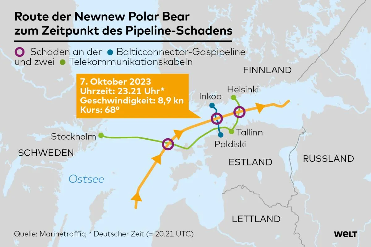 Der Zeitpunkt des Schadens fiel mit der Fahrt eines unter Hongkong-Flagge fahrenden Containerschiffs namens NewNew Polar Bear zusammen, das sich vom 3. bis 8. Oktober auf dem Weg vom russischen Marinestützpunkt Baltijsk (nahe Kaliningrad) nach St. Petersburg befand: