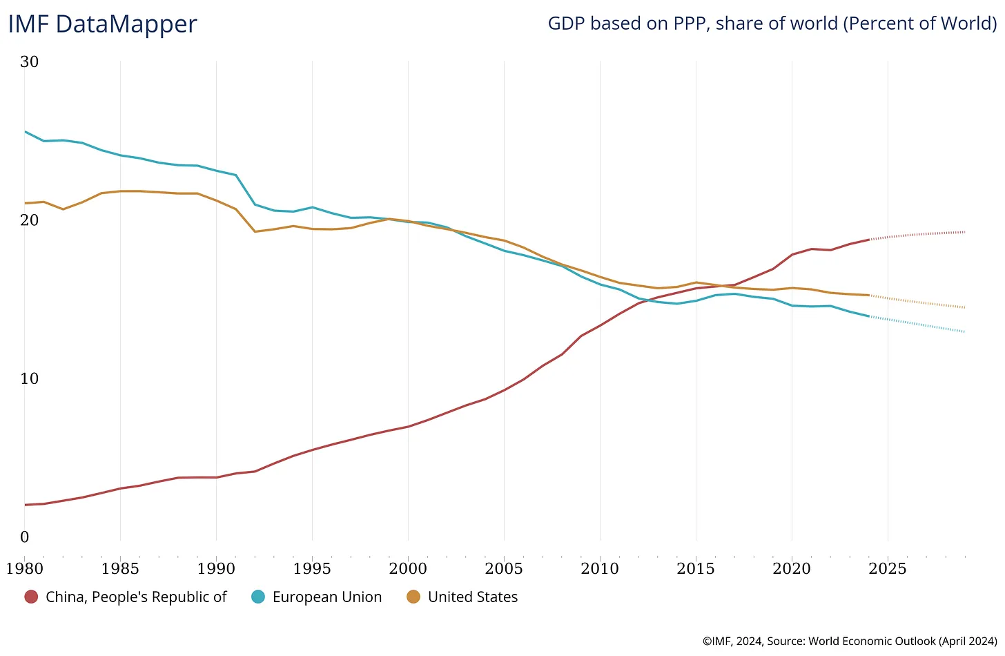 „Was China in den letzten 40 Jahren getan hat, ist einzigartig in der Geschichte der Menschheit“, gestand er. „In den letzten 30 Jahren ist der Anteil Chinas am Welt-BIP (zu Kaufkraftparitäten) von 6 % auf fast 20 % gestiegen, während wir Europäer von 21 % auf 14 % und die Vereinigten Staaten von 20 % auf 15 % gesunken sind“.