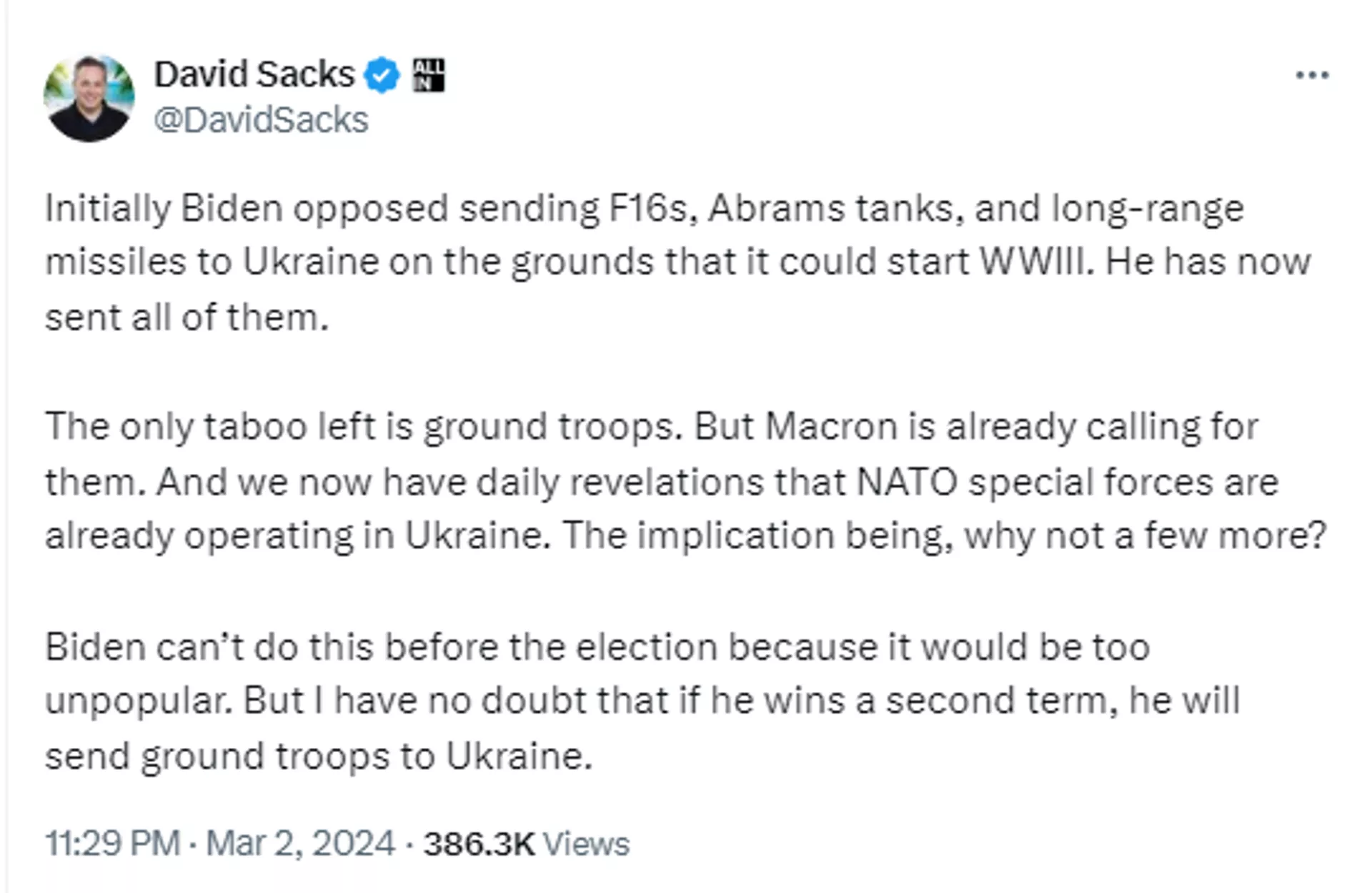 Zunächst war Biden „gegen die Entsendung von F16, Abrams-Panzern und Langstreckenraketen in die Ukraine mit der Begründung, dass dies den Dritten Weltkrieg auslösen könnte„, erinnerte Sachs und fügte hinzu, dass „das einzige Tabu noch Bodentruppen sind„.